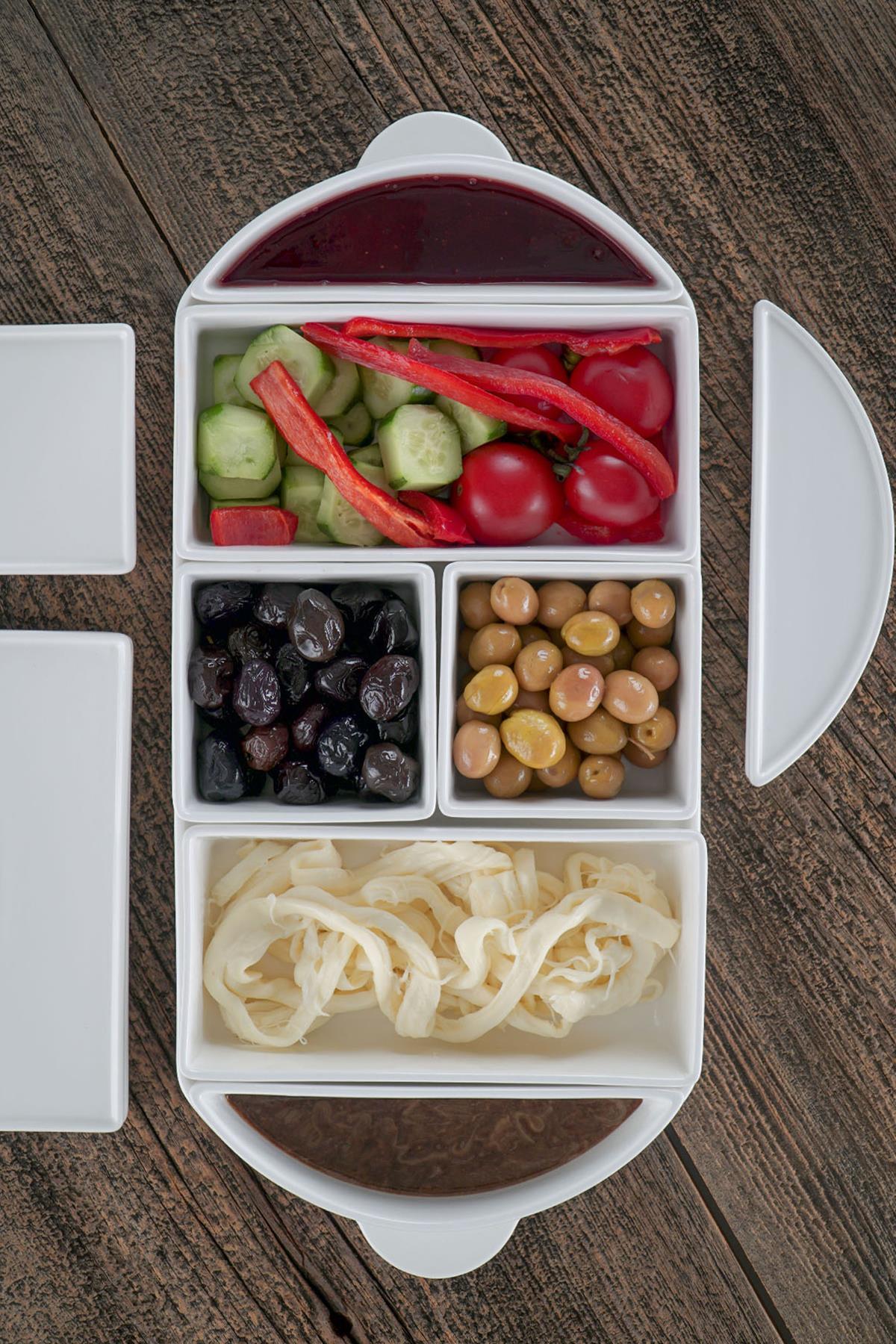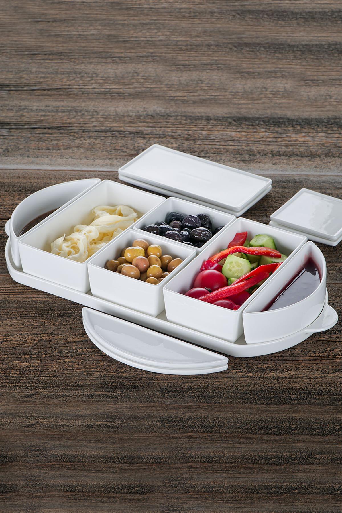Acar „Bianco Perla“ 13 teilig 1x untere Platte 2x rechteckige Schalen 2x quadratische Schalen 2x halbkreis Schalen 6x Deckel Maße: ca. 42cm x 19cm Material: Porzellan Spülmaschinen geeignet