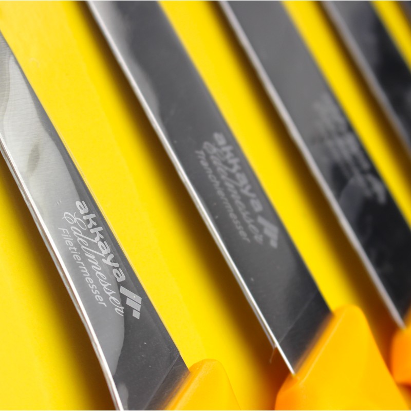 Akkaya Solingen Edelmesser Set 5er Set 1x Aufschnittmesser 1x Ausbeinmesser 1x Hackmesser 1x Tranchiermesser 1x Filetiermesser Farbe: Orange Material: 18/10 Edelstahl Spülmaschinen geeignet