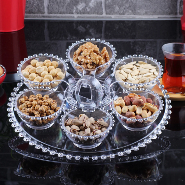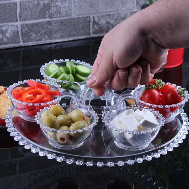 „Boncuk“ Snackset 7 teilig Durchmesser Schale: ca. 9cm Durchmesser Tablett: ca. 28,5cm Höhe: ca. 4cm Material: Acryl