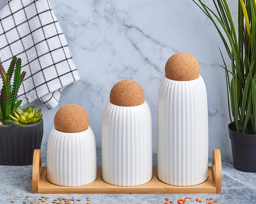 “Cork Line” Vorratsbehälter 7 teilig 3x Behälter 3x Korkendeckel 1x Stand Durchmesser: ca. 8,7cm Höhe: ca. 10cm / 14,5cm / 19cm (ohne Korken) Material: Porzellan Spülmaschinen geeignet (ohne Korken)