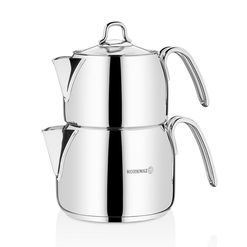 Korkmaz „Perla Mega“ Volumen: ca. 1,8L / 3,2L Material: 18/10 Cr-Ni Edelstahl Farbe: Silber Geeignet für alle Herdarten, inkl. Induktion