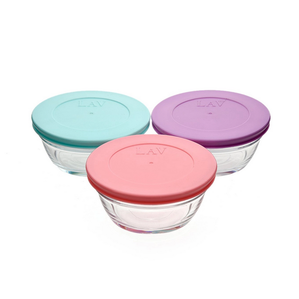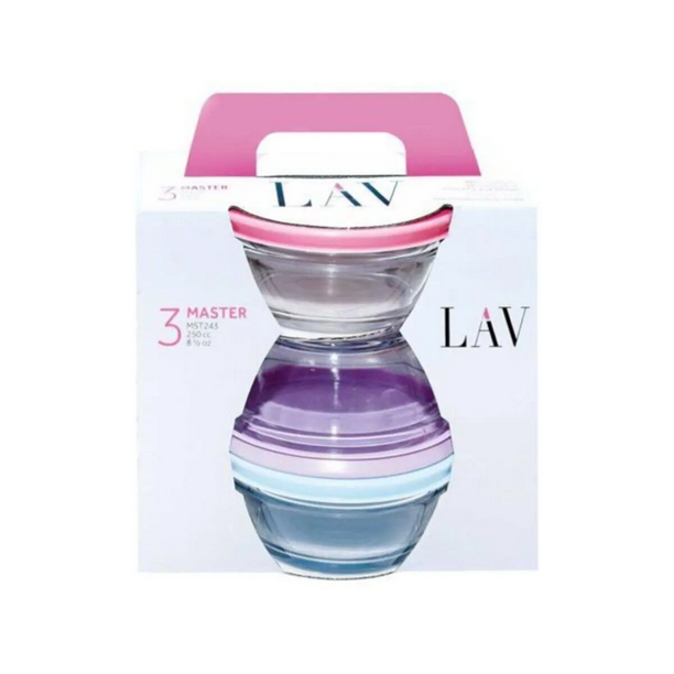 LAV „Master“ 3 Stück Volumen: ca. 250cc Durchmesser: ca. 10,5cm Höhe: ca. 4,8cm Material: Glas Farbe: Lila / Rosa / Mint Spülmaschinen geeignet