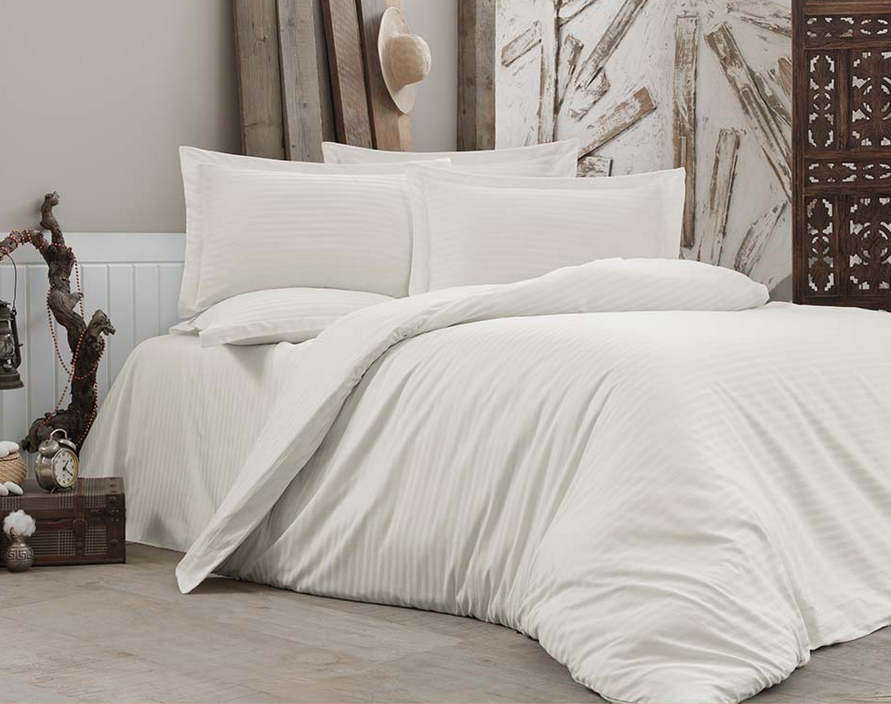 „Line“ Bettwäsche Set 6 teilig 1x Bettbezug ca. 200cm x 220cm 1x Bettlaken ca. 240cm x 260cm 4x Kissenbezüge ca. 50cm x 70cm Farbe: Creme Material: 100% Baumwolle