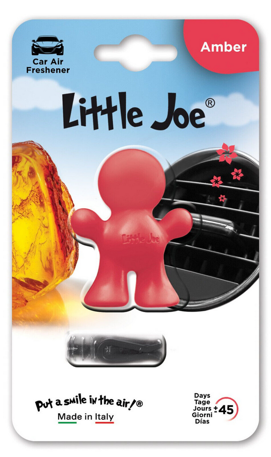 Little Joe „Amber“ 1 Stück Maße: ca. 4cm x 5cm x 2cm Duftnote: Amber Inkl. zweistufiges Clipsystem fürs Lüftungsgitter Bis zu 45 Tage Duftfreisetzung