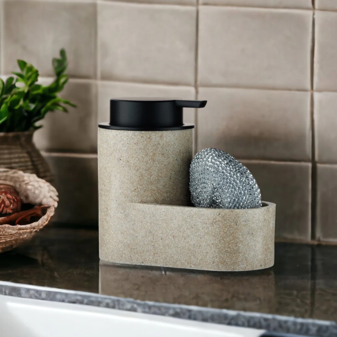 „Marble“ Seifenspender 1 Stück Maße: ca. 14,8cm x 7,7cm x 13,5cm Material: Polyresin Farbe: Granitoptik Inkl. kleiner Schwamm