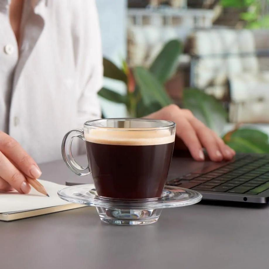 Pasabahce „Aqua“ 12 teilig für 6 Personen 6x Tee- / Kaffeetassen 6x Unterteller Volumen: ca. 215cc Material: Glas Spülmaschinen geeignet