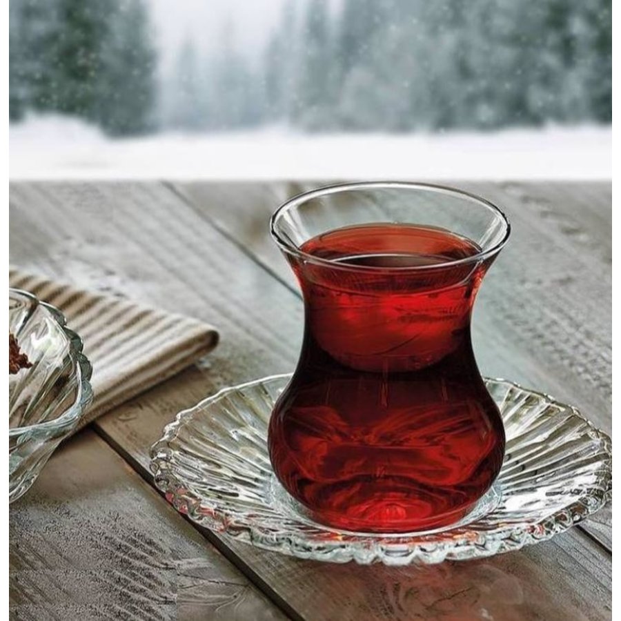 Pasabahce „Aurora“ 12 teilig für 6 Personen 6x Teegläser 6x Unterteller Volumen: ca. 155cc Durchmesser Unterteller: ca. 126mm Material: Glas Spülmaschinen geeignet