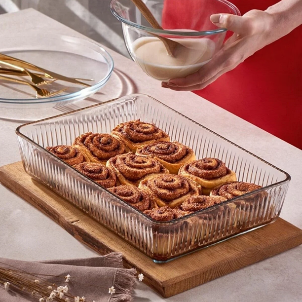 Pasabahce Borcam „Premium“ 1 Stück Volumen: ca. 3000cc Maße: ca. 30,6cm x 20,9cm x 6,5cm Material: Glas für den Ofen geeignet Spülmaschinen geeignet backen, kochen und servieren! Mit dieser Auflaufform ist alles möglich