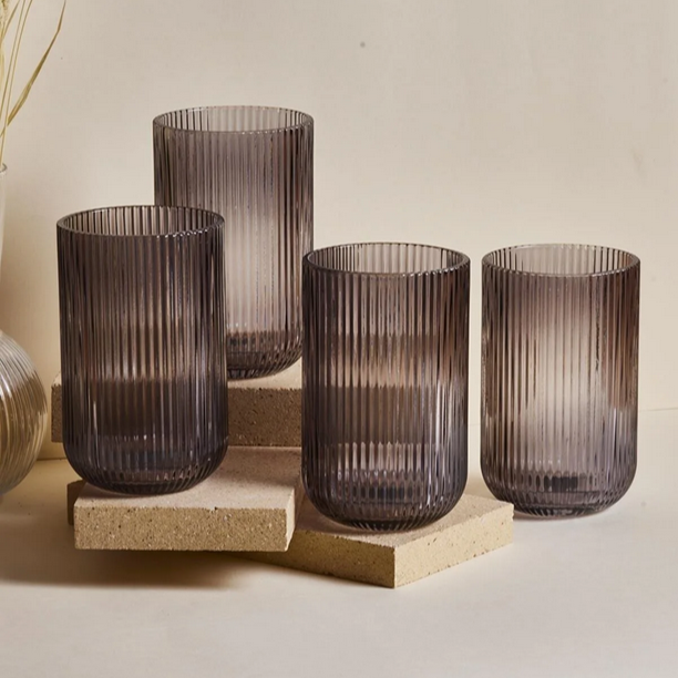 Perotti „Imola Smocked“ 4 Stück Volumen: ca. 440cc Durchmesser: ca. 8cm Höhe: ca. 12,5cm Material: Glas Spülmaschinen geeignet