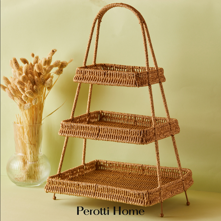 „Rattan“ Etagere 1 Stück Gesamthöhe: ca. 51cm Maße: ca. 13cm x 18cm (oben) / ca. 18cm x 24cm (mitte) / ca. 24cm x 29cm (unten) Material: Rattan Form: Rechteck Nicht Spülmaschinen geeignet