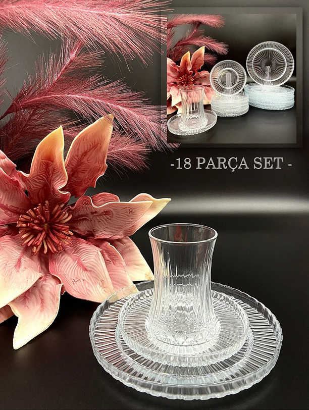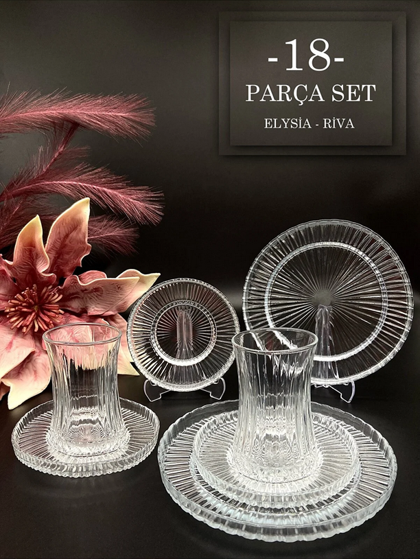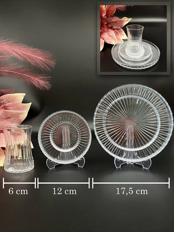 „Riva/Elysia“ Teeglas- und Dessertteller 18 teilig 6x Teeglas Elysia (ca. 170cc) 6x Unterteller Riva (ca. 120mm) 6x Dessertteller Riva (ca. 175mm) Material: Glas Spülmaschinen geeignet