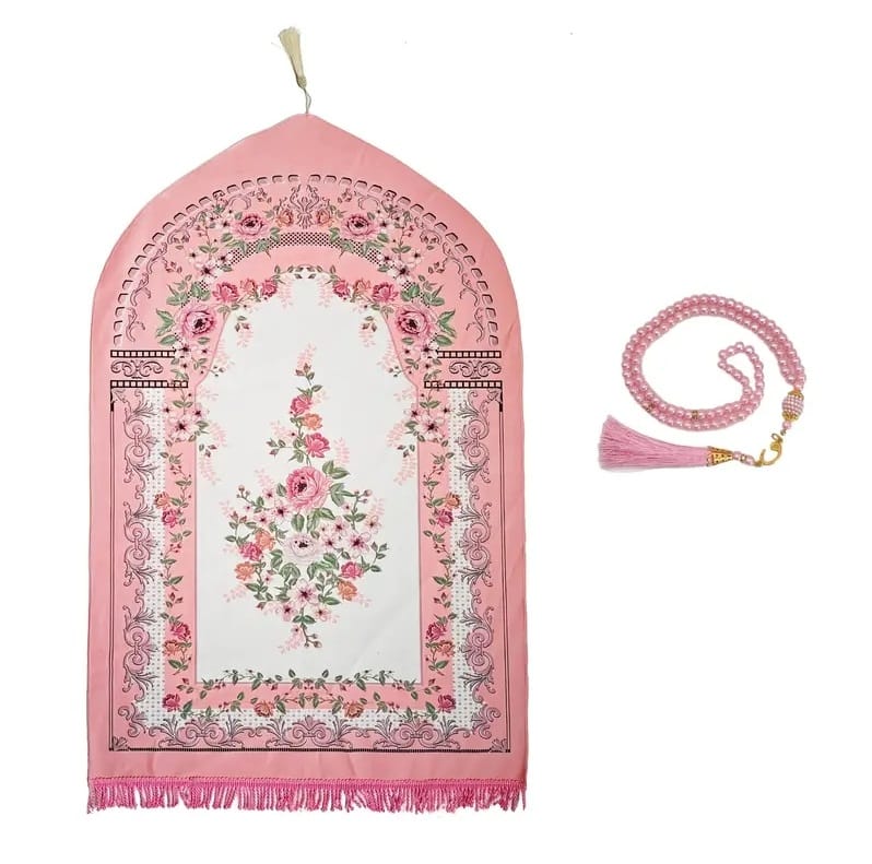 „Rose“ Gebetsteppich mit Gebetskette 2 teilig 1x Gebetsteppich 1x 99 Steine Gebetskette Maße Gebetsteppich: ca. 70cm x 110cm Material: Polyester Design: Digitaldruck