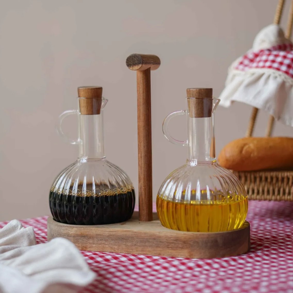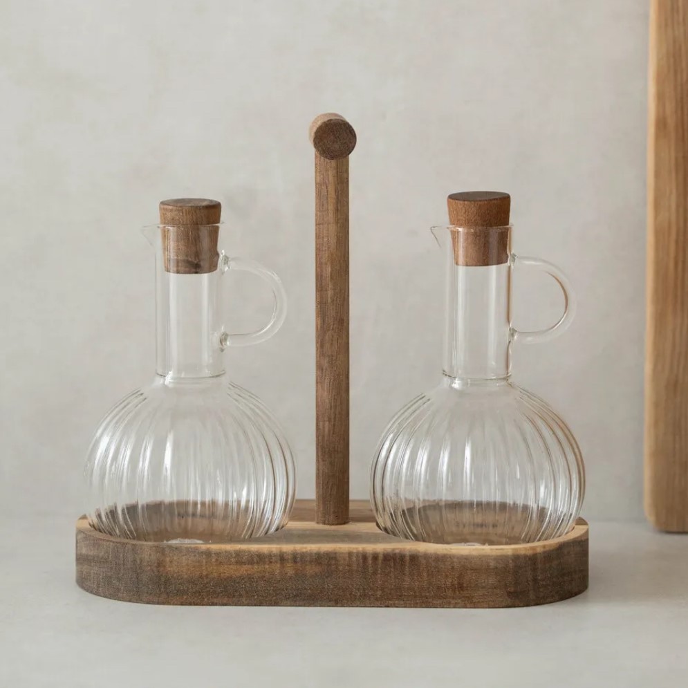 „Tombik“ Ölspender 3 teilig Volumen: ca. 300ml Höhe: ca. 16cm Material: Borosilikatglas / Akazienholz