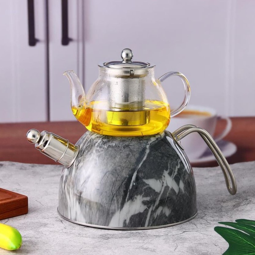 Wasserkessel mit Teekanne 1x Teekanne 1x Wasserkessel Volumen: ca. 600ml / 3000ml Material: Borosilikatglas / Edelstahl Farbe: Marmor Grau Kessel mit Pfeiffunktion Am Deckel integrierter Sieb Für Induktion geeignet